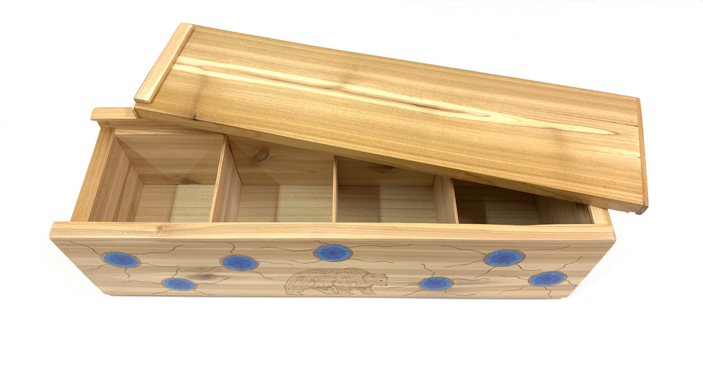 This expertly crafted medicine box is made from aromatic cedar and features a sliding lid. The inside is segmented into four compartments to separately store your medicines. Felt pads on the bottom of the box protect your table tops and prevents wear and tear on the wood. This one of a kind medicine box is hand painted and detailed with an image of a bear and blue spirits representing the Seven Grandfather Teachings.