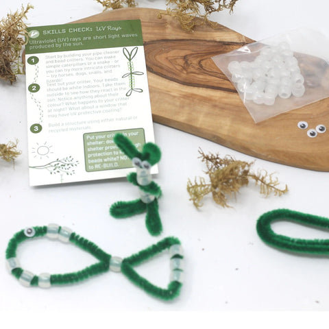 In this DIY UV-Shelter craft pack you are challenged to build a structure to protect an animal craft (made from UV-sensitive beads) from the sun. If the beaded animal changes colour, your shelter did not work and have the opportunity to make improvements. Your animals can be a simple snake or snail or a more complex lizard, bunny, or horse!